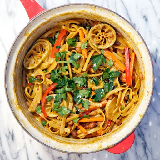 Remove slices of ginger and stir in cilantro and lime juice. Dish up the pasta and then sprinkle on garnishes as desired.