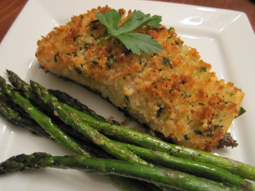 Place the salmon fillets, skin side down, on a board. Generously brush the top of the fillets with mustard and then sprinkle generously with salt and pepper. Press the panko mixture thickly on top of the mustard on each salmon fillet. The mustard will help the panko adhere.