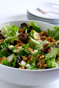 2. Add spring mix to a large bowl. Top with thinly sliced pears, feta cheese and walnuts. Drizzle with balsamic vinegar and olive oil. Add freshly cracked black pepper to taste. Toss salad to incorporate all ingredients.