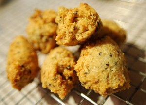 Working in batches, drop tablespoons of mixture into the hot oil. Cook, turning occasionally, until golden brown, 2 to 3 minutes. Drain on paper towels, serve with dipping sauce.