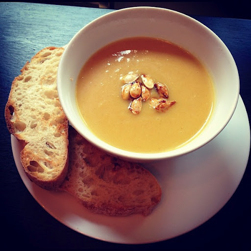 So good! Warm, slightly spicy with just a touch of sweet. Perfect topped with toasted pumpkin seeds and a slice of toasted ciabatta.