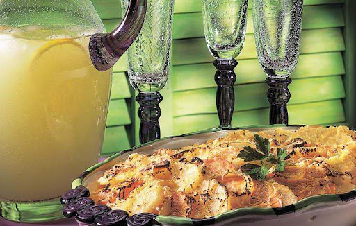 .3Preheat oven to 375F. Grease 13x9-inch baking dish with butter. Peel potatoes; cut crosswise into thin slices. Layer half of baking and sweet potato slices in prepared dish. Spoon half of onion mixture evenly over potatoes. Repeat layering. Cover. Bake until heated through, about 25 minutes.