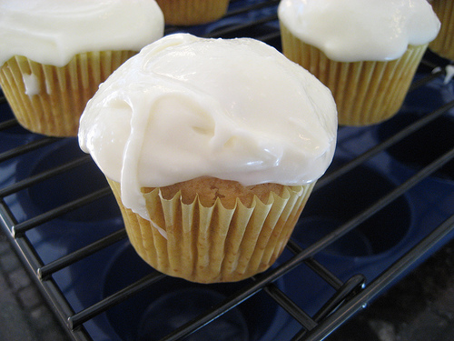 Line a cupcake tray with paper liners, and fill about 2/3 full. These guys poof up a bit, so don’t overfill them (as I am prone to do). Bake at 350 F for 20-25 min. or until a toothpick comes out clean.