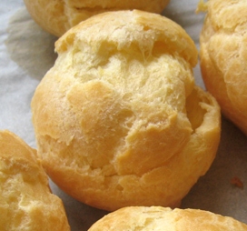 Bring water, butter, and salt to a boil in a medium saucepan over medium-high heat. Remove from heat, and stir in flour. Return to heat, and cook, stirring constantly with a wooden spoon, until mixture pulls away from sides of pan, about 4 minutes. Transfer to the bowl of a mixer fitted with the paddle attachment. Mix on medium speed to cool slightly, about 1 minute. With machine running, add eggs, 1 at a time, beating well after each addition. Spoon dough using a teaspoon onto the parchment paper.
