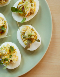 3. In a large bowl, add 4 of the egg yolks (use the rest another time) and mash them using the back of a fork. Add the chicken, mayonnaise, mustard, Tabasco, pickles and scallions. Mix until combined and season with salt. Spoon the mixture into the reserved egg whites, top with radish sprouts and serve.