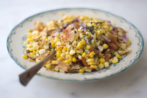 Melt the butter in a large skillet over medium heat. Add the corn, sprinkle with a couple pinches of salt and stir well, you want all the corn to be coated. Cook for just a minute, until the corn looses its raw edge, stir in half the thyme, and then transfer the corn to a large serving bowl. Just before you're ready to serve, add most of the coconut flakes, most of the almonds, the rest of the thyme, red onions, and citrus juice. Stir well. Taste, season with more salt, to taste, and serve topped with the remaining coconut and almonds (and another jolt of juice if needed!).