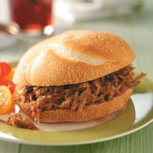 In a small saucepan, combine jelly and peppers. Cook over medium heat for 5 minutes or until heated through. Remove meat from slow cooker; discard cooking liquid. Shred pork with two forks. Return to the slow cooker; top with jelly mixture. Cover and cook on low for 30 minutes or until heated through. Spoon about 2/3 cup meat onto each roll. Yield: 10 servings.