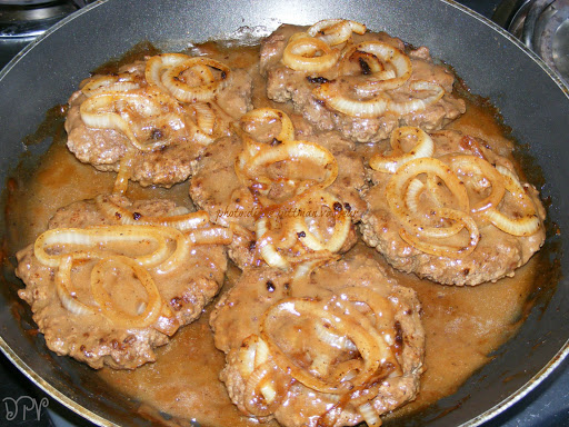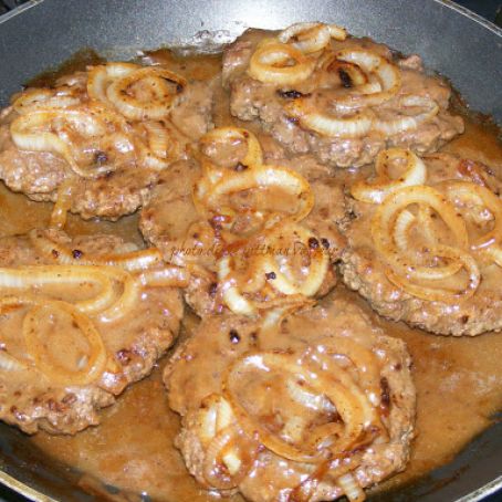 Pan-grilled seasoned ground beef patties and onions in a yummy brown gravy for potatoes. This popular diner dish is Southern comfort food at its best!