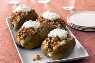 SPLIT potatoes; mash insides with fork. Top with meat mixture and sour cream.