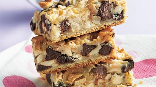Remove partially baked crust from oven. Sprinkle vanilla chips, chocolate chips, almonds and cashews evenly over crust. Pour condensed milk evenly over top.
