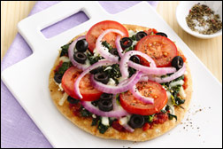 Place onion, olive, and tomato slices on top of your "pizza," and sprinkle with oregano.