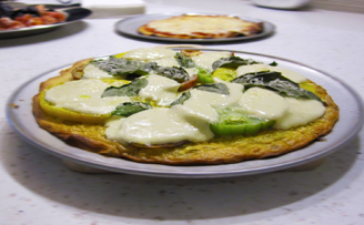 Reheat oven to 500 degrees. Slice the heirloom tomatoes and fresh mozzarella in to quarter-inch slices. Drizzle a little olive oil on the top of the cooled crust, layer the tomatoes on the cooled crusts and then top with slices of cheese. Return to oven for 8 minutes, or until cheese is melted. Add the fresh basil and return to oven for 2 minutes.
