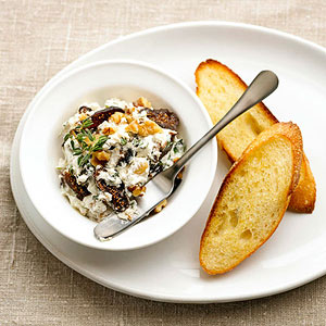 1. In a small bowl pour boiling water over figs to cover; let stand 15 minutes. Drain well. 2. Meanwhile, in a medium bowl stir together chevre, sour cream, basil, milk, and thyme. Season to taste with salt and pepper. Stir in drained figs and half the walnuts. Cover and chill in refrigerator up to 24 hours. 3. To serve, transfer spread to serving bowl. Sprinkle with remaining walnuts and fresh thyme sprigs. Serve with baguette slices or crackers. Makes about 1-1/2 cups (twelve 2-tablespoon servings)