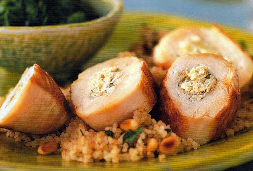 4. Top each breast half with 2 tbs cheese mixture and roll up jelly-roll fashion. Secure each roll with wooden picks.
