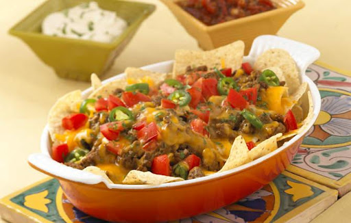 4.Top the chips with the beef. Sprinkle with the Cheddar, jalapeno pepper, tomato and cilantro, if desired. Bake until the cheese is melted, 5 to 10 minutes. Serve with the salsa and sour cream.