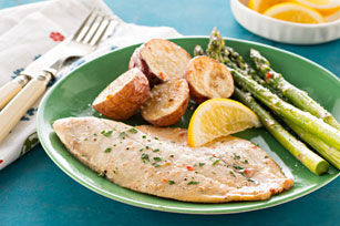 ADD fish to oven with vegetables. Bake 10 min. or until potatoes are tender and fish flakes easily with fork. Drizzle remaining dressing over vegetables; toss to coat. Top with cheese. Sprinkle parsley over fish; serve with vegetables and lemon wedges.