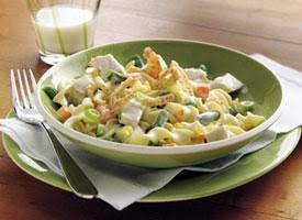 2. Meanwhile, spray 12-inch skillet with cooking spray; heat over medium heat. Add mixed vegetables and green onions; cook about 4 minutes, stirring frequently, until vegetables are crisp-tender. Stir in cream cheese and milk until blended. Stir in chicken, garlic salt and pepper; cook until hot.