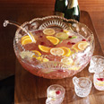 Combine all the fruits in a large punch bowl. Add the gin, juice, syrups, crème de framboise, and water. Refrigerate for at least 4 to 5 hours. Just before serving, add the champagne and the decorative ice block.