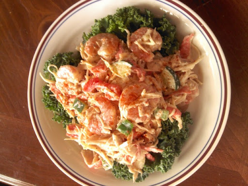 Steam or boil shrimp, set aside to cool. Dice all vegetables. In a large bowl combine the imitation crab, shrimp and vegetables. Season with garlic powder, black pepper & Old Bay to taste. Mix well. Fold in the Mayonaise, Ranch Dressing and Cheese. Sprinkle Paprika on top. Chill & Serve over a bed of lettuce.
