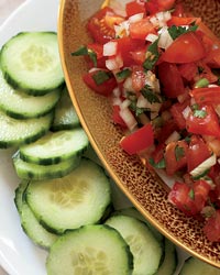 In a bowl, toss the tomatoes with the onion, cilantro, jalapeño and lime juice and season with salt and pepper. Serve the salsa with the cucumber chips for dipping.