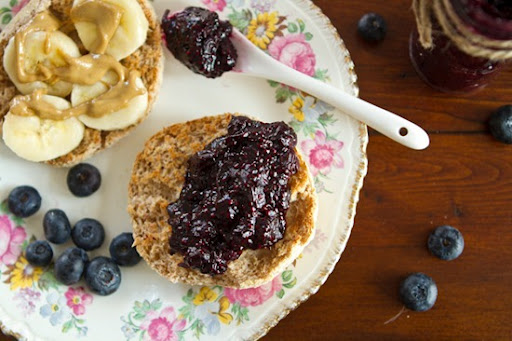 1. In a medium-sized non-stick pot, bring the blueberries and 3 tbsp of maple syrup to a low boil. Stir frequently, and reduce heat to low-medium to simmer for about 5 minutes. Lightly mash the blueberries with a potato masher or fork, leaving some for texture.