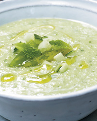Green Zebras are heirloom tomatoes with a striped pattern; they are sweet like red tomatoes but give this gazpacho a lovely jade hue. To make the chilled soup extra tangy, use tomatillos or unripe red tomatoes instead of Green Zebras.