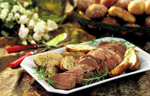 .5Bake until lamb is done to taste, about 45 minutes for medium-rare. Let stand for 5 minutes. Cut into slices. Arrange lamb slices and potatoes on a serving platter. Serve immediately with pan drippings, if desired.