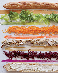 Toast the baguettes in the oven for 5 minutes, until crusty. Split and cut each baguette into 4 lengths. Spread the mayonnaise on the bread and top with the beets and onion. Top with the chicken, carrots and lettuce. Close the sandwiches and serve.