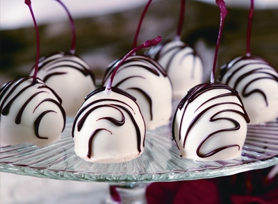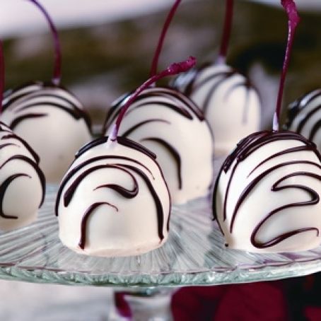 Maraschino cherries wrapped in a buttercream mixture are dipped in white chocolate and drizzled with dark chocolate.