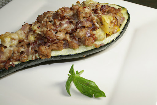 Cut a slice off the side of the zucchini to create a large boat. Scoop out the inside of the squash leaving a shell and bake the shell in the preheated oven for 20 minutes.
