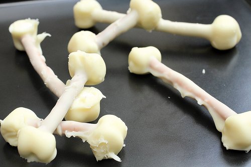 White chocolate coats these 'bones' made from pretzels and marshmallows. Make different size bones with different sizes of pretzels and marshmallows.