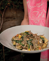 "Our audience has really been receptive to our homemade alternative-flour pastas," says Travis Lett. He likes buckwheat for its added richness and texture. At the restaurant, Lett cuts the fresh pasta into rough rag shapes and tosses it with summer vegetables; this simplified version uses dried pasta.