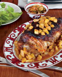 Inspired by the retro combination of ham and pineapple, Jean-Georges Vongerichten created this twist by mixing the pineapple with vinegar for a sweet-sour effect, and marinating pork shoulder with hot paprika and Sriracha chile sauce. "Chile is my condiment of choice: A little here, a little there, makes the food sing," he says.
