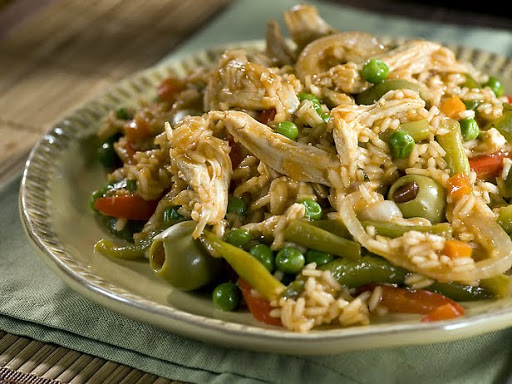 Meanwhile, melt the butter in a large skillet over medium heat. Add the peppers and the remaining sliced onions and cook until they're tender, 8 minutes. Shred the cooked chicken meat discarding the skin and bones, and add the chicken to the vegetables. Cook until it is heated through, 2 to 3 minutes. Fluff the rice with a fork and add the chicken and vegetables to the rice mixture. Stir in the olives, sprinkle with the remaining cilantro and serve.