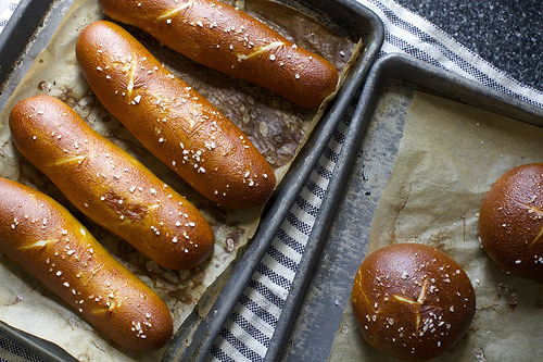 Bake pretzels: If using either baking soda method, beat egg with a teaspoon of water and brush it over poached pretzels for improved glossiness. If desired, make slashes in buns (I like a criss-cross on round buns and three diagonal ones on hot dog buns; slash deeper than you think necessary or the lines will disappear, as mine did in this batch). Sprinkle pretzels with coarse or pretzel salt and bake for 12 to 15 minutes, rotating tray once to get an even, dark color. Transfer to rack. Serve warm.