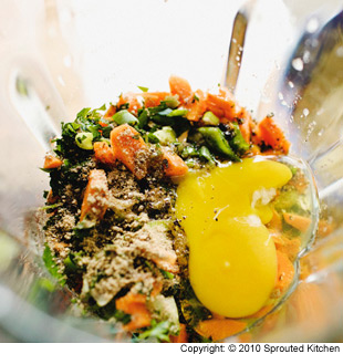 3. In a blender or food processor, pulse carrots and parsley. Add green onion, garbanzos, sesame seeds, lemon juice, eggs, garlic clove, coriander and cumin. Season with salt and fresh ground pepper. Pulse until roughly combined; add quinoa, and another few pulses. I prefer it chunky. Taste for seasonings. Allow to set in fridge for an hour. It will be fine resting overnight if you really like to plan ahead.