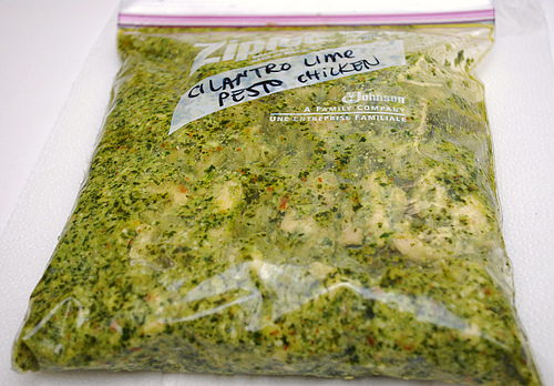 * To make ahead/freezer meal - Place raw, cut-up chicken in freezer bag. Prepare cilantro lime pesto as directed below. Place a 1/2 cup of pesto in freezer bag with the chicken. Freeze. When ready to prepare, defrost and heat, fry or grill chicken. Prepare tacos with desired garnishes