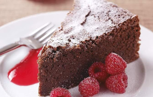 “A slice of this dense, rich chocolate cake with raspberry sauce is sure to delight—it’s simplylove at first bite!”