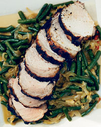 Grilled Pork Rib Roasts with Green Beans and Onions