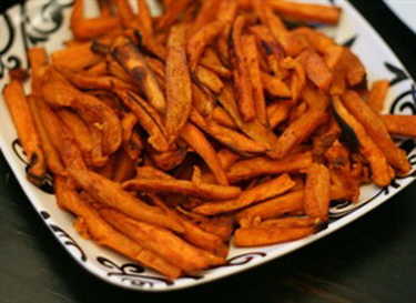 Peel the sweet potatoes. Cut each potato in half, and then into quarters. Then, slice into fry shapes, about 1/2 inch wide.