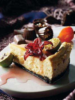 To make the meringues: Whip the egg whites together with 3 tablespoons granulated sugar and white vinegar. Delicately fold this meringue into the cheesecake mixture. Pour evenly into the springform pan, over the chocolate crust.