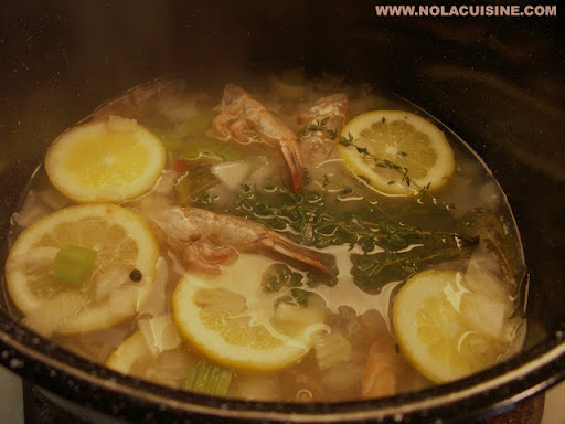 Add all ingredients to a 2 qt. saucepan. Cover this with cold water, it should be about 6-8 Cups Cups. You’ll need 1 1/2 Cups for the Etouffee. Bring almost to a boil, reduce the heat to a low simmer. Simmer for about 45 minutes to an hour. Strain.