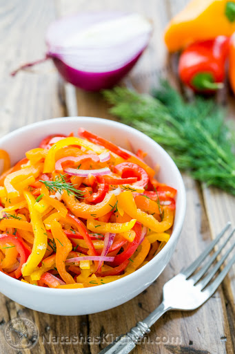 Remove the tops and seeds from bell peppers, then cut them in half lengthwise and cut into thin strips. It was quicker to stack two bell peppers and cut two halves at a time. Transfer sliced bell peppers to a large mixing bowl.