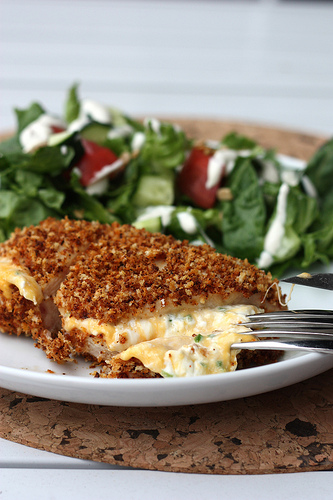 Using a small utility knife, cut a pocket into the side of each chicken breast, or horizontally slice the chicken through the center, until it is almost butterflied. Season the chicken lightly with salt and pepper, and then divide the cream cheese mixture evenly between each chicken breast’s pocket. Use toothpicks to secure, if necessary.