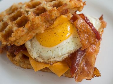 Assemble: Lay two slices of bacon on each egg-topped cheesy waffle, then create a sandwich by placing the second cheesy waffle, cheese side-down, on top. Serve with ketchup if you want.