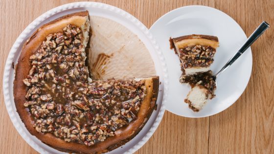 Melt butter in a small saucepan over medium heat. Add brown sugar and cook until bubbling, about 3-5 minutes. Remove from heat and stir in 1 1/2 cups toasted pecans, 1/3 cup heavy cream and pinch of salt. Let cool to room temperature then spoon over.