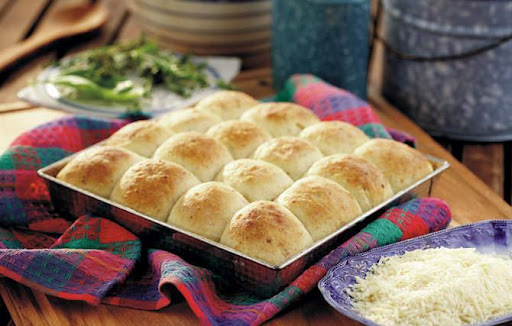 5.Let rise, covered, for 45 minutes. Punch down dough. Let stand for 10 minutes. Shape into 16 balls. Dip in melted butter. Arrange in a greased 9 × 9-inch baking pan. Let rise, covered, for 15 minutes.