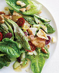 2. In a large bowl, toss the mesclun with the grilled asparagus, cucumber, tomatoes, chickpeas, olives and cheese.