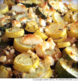 Remove from heat and season with salt and pepper. Lay the squash and zucchini nicely on top of the onion, pour the contents of the pan on top, and top with crumbled feta.