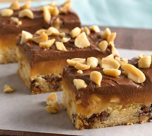 3 Spread frosting evenly over filling. Sprinkle with chopped peanuts. Refrigerate about 2 hours or until chilled. For bars, cut 9 rows by 4 rows. Store covered in refrigerator.